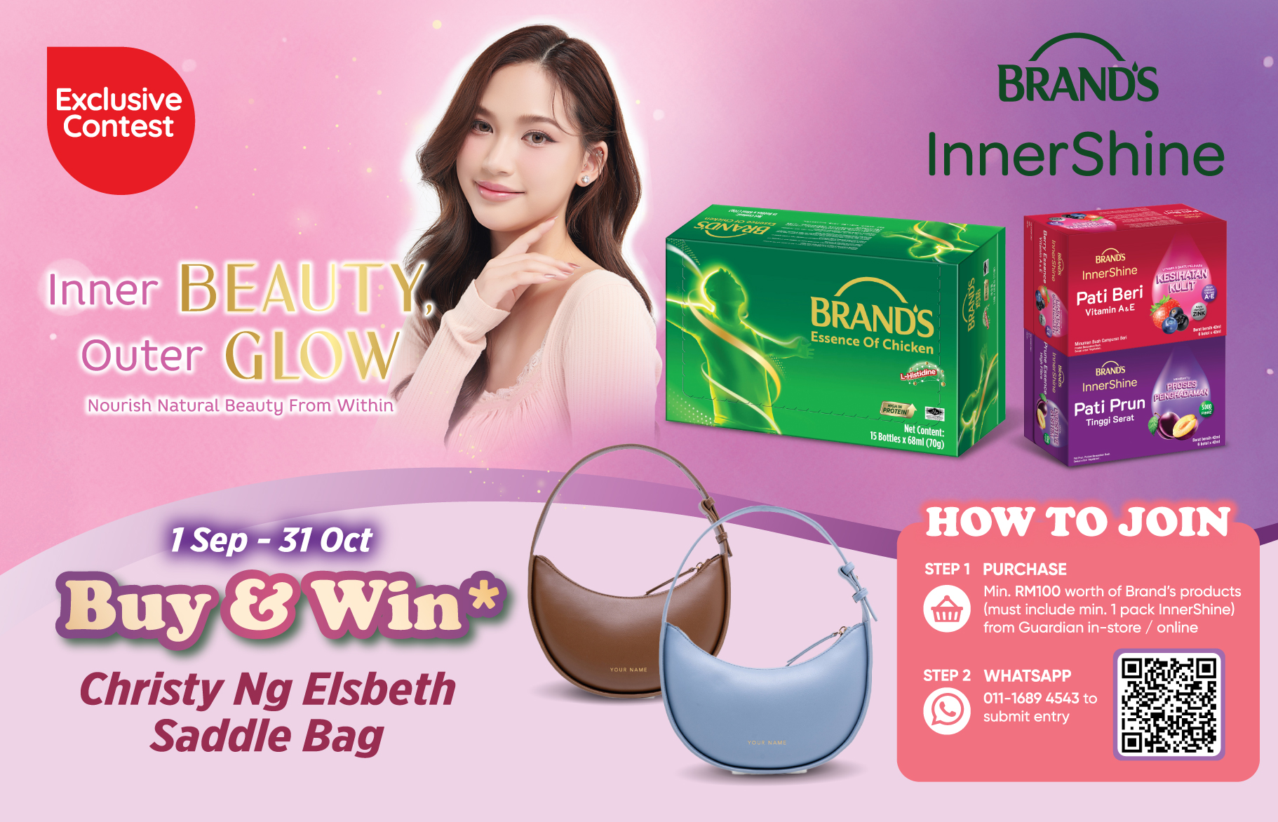 - a) Participants must purchase any BRAND’S® products worth RM100 and above (purchase must include 1 pack Innershine) from any Guardian physical store or Guardian online store during the Campaign Period.